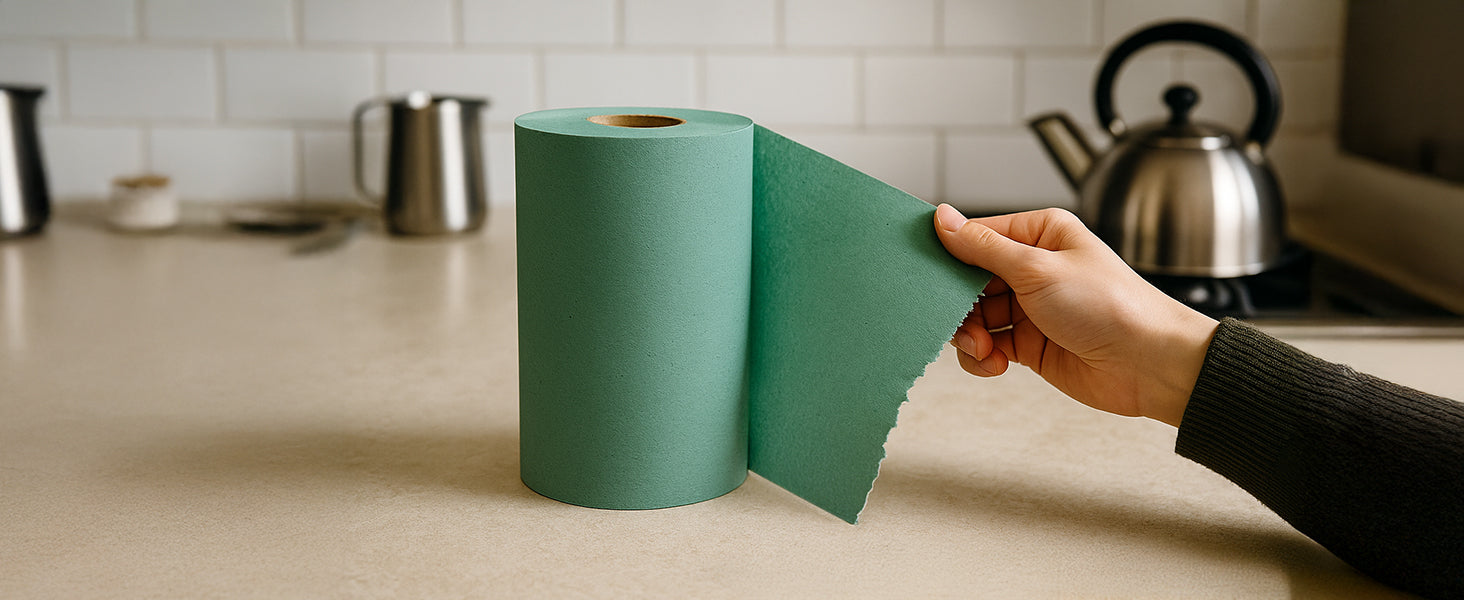 Strong and absorbent 1-ply green cleaning rolls, supplied in a value pack of 16 & 32. Each roll measures 76m x 20cm and fits standard dispensers. Ideal for wiping, drying, and spill control in kitchens, workplaces, and high-traffic environments.