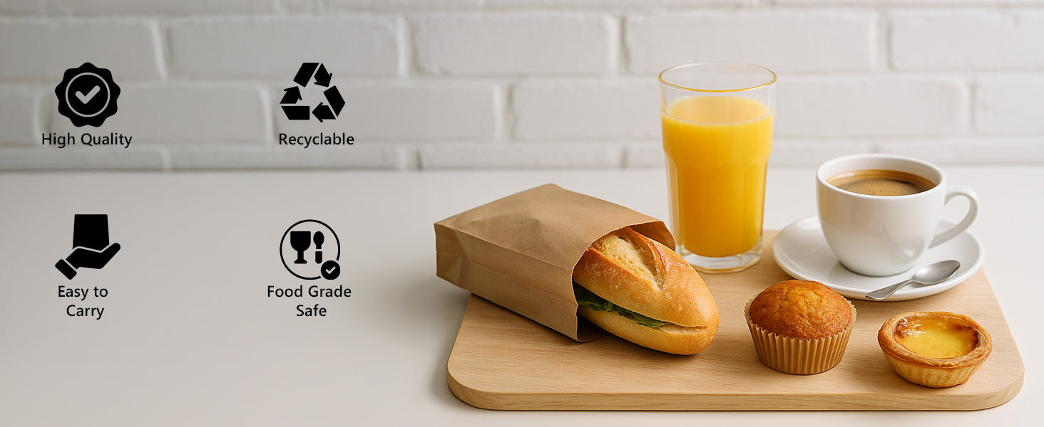- Flat-Bottom Design: Built with a solid square base, these kraft paper bags stand upright for easy filling and secure carrying—ideal for restaurants, cafes, bakeries, and retail shops
